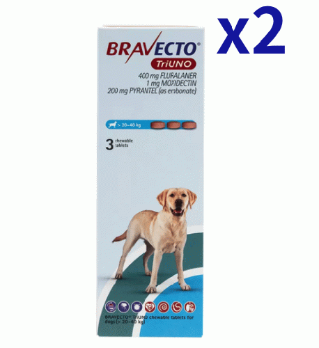 ブラベクトトリウノ >20-40kg | 3錠x2箱 | ノミ | マダニ | フィラリア